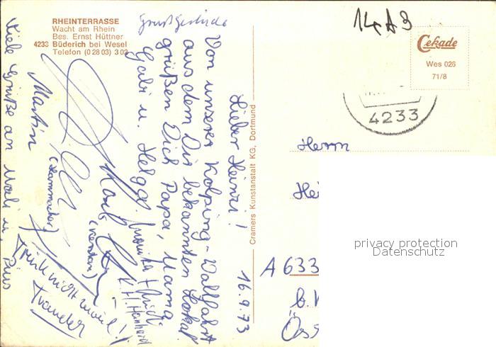 71946843 alte Postkarte Buederich Wesel Rheinterrasse Wacht am Rhein postalisch gelaufen Erhaltung siehe scans KatCode: 11110005170048