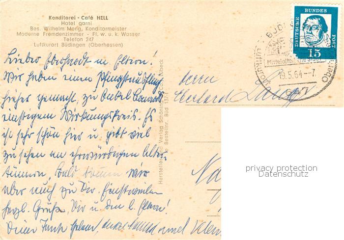 73829837 alte Postkarte Buedingen Hessen Moehltor Schloss Jerusalem Tor Konditorei Cafe Hell Hotel Garni postalisch gelaufen Erhaltung siehe scans [WerneD78] KatCode: 11110006440004