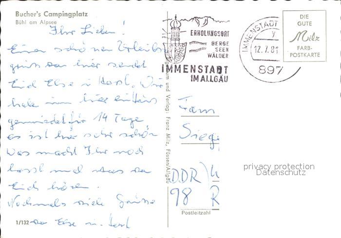 72456217 alte Postkarte Buehl Alpsee Buchers Campingplatz postalisch gelaufen Erhaltung siehe scans KatCode: 11110009780124