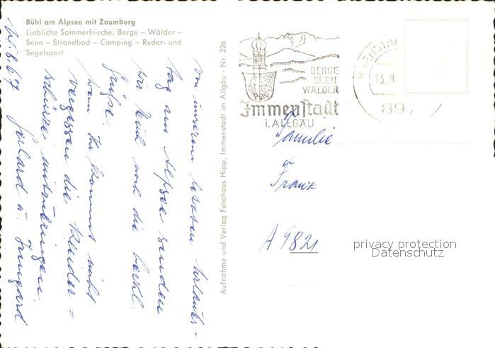 72370344 alte Postkarte Buehl Alpsee Zaumberg Berge Wald See Strandbar Camping postalisch gelaufen Erhaltung siehe scans KatCode: 11110009780124