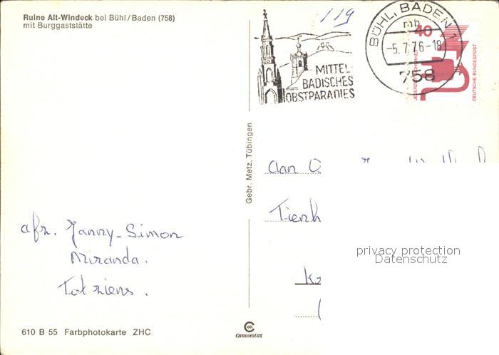 72033986 alte Postkarte Buehl Baden Burgruine Alt Windeck Burggaststaette postalisch gelaufen Erhaltung siehe scans KatCode: 11110008216007