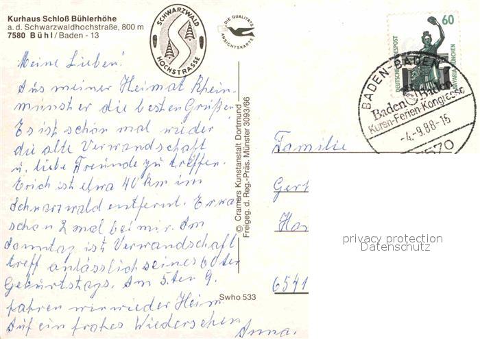 72890218 alte Postkarte Buehl Baden Fliegeraufnahme Kurhaus Schloss Buehlerhoehe postalisch gelaufen Erhaltung siehe scans [AndreD76] KatCode: 11110008216007
