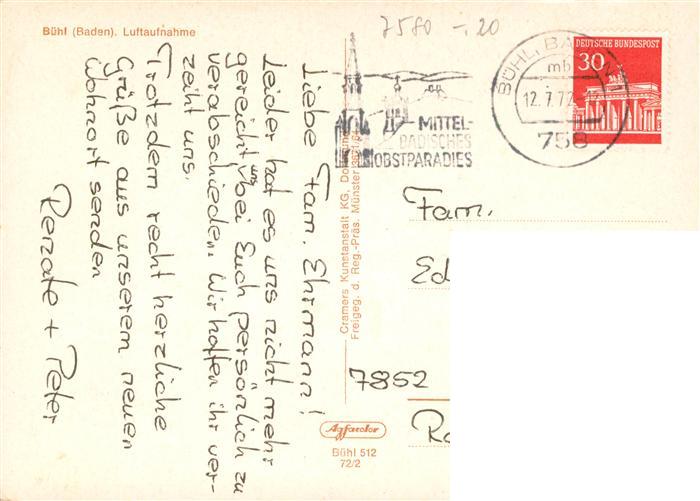 73902641 alte Postkarte Buehl Baden Fliegeraufnahme postalisch gelaufen Erhaltung siehe scans [FriedD77] KatCode: 11110008216007