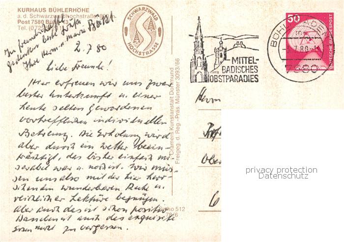 73787797 alte Postkarte Buehl Baden Kurhaus Buehlerhoehe Fliegeraufnahme postalisch gelaufen Erhaltung siehe scans [WerneD78] KatCode: 11110008216007