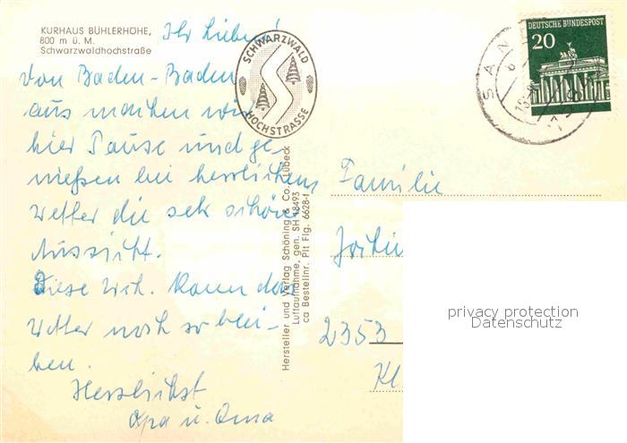 72907052 alte Postkarte Buehl Baden Kurhaus Buehlerhoehe Schwarzwaldhochstrasse postalisch gelaufen Erhaltung siehe scans [FriedD77] KatCode: 11110008216007