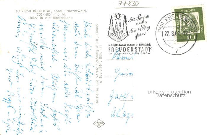 73763566 alte Postkarte Buehlertal Blick in die Rheinebene postalisch gelaufen Erhaltung siehe scans [FriedD77] KatCode: 11110008216008