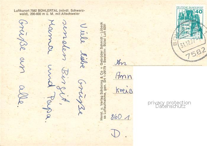 73761207 alte Postkarte Buehlertal Fliegeraufnahme mit Altschweier postalisch gelaufen Erhaltung siehe scans [WerneD78] KatCode: 11110008216008