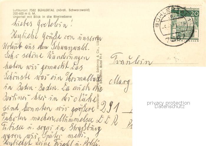 73766881 alte Postkarte Buehlertal Untertal mit Blick in die Rheinebene postalisch gelaufen Erhaltung siehe scans [FriedD77] KatCode: 11110008216008