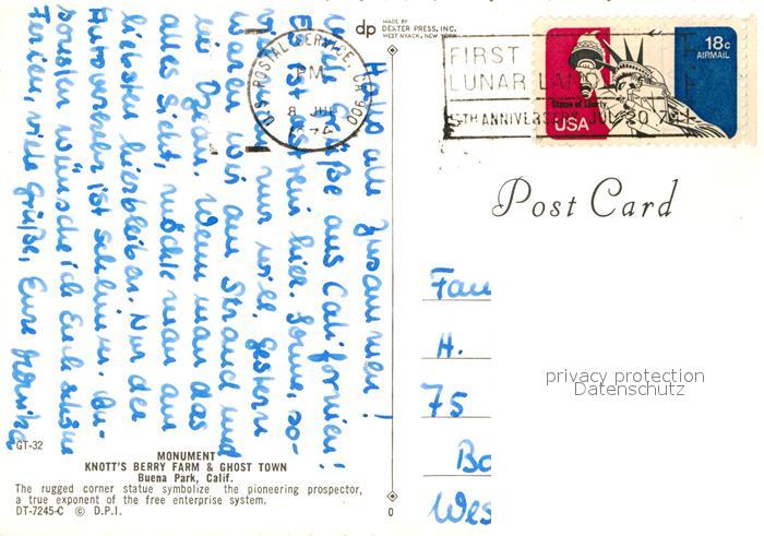 72950479 old postcard Buena Park Monument Knotts Berry Farm Ghost Town postalisch gelaufen Erhaltung siehe scans [NatalD47] KatCode: 14140050000000