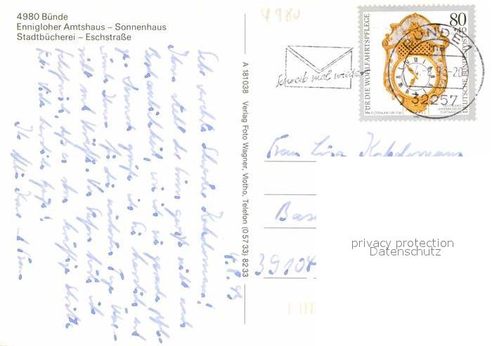 72869540 alte Postkarte Buende Westfalen Ennigloher Amtshaus Sonnenhaus Stadtbuecherei Eschstrasse postalisch gelaufen Erhaltung siehe scans [LiesaD40] KatCode: 11110005758004