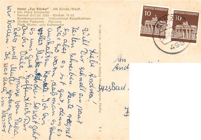 73876567 alte Postkarte Buende Westfalen Hotel Zur Klinke Ansicht mit Kegelbahn Gastraum Fruehstueckszimmer Halle postalisch gelaufen Erhaltung siehe scans [FriedD77] KatCode: 11110005758004