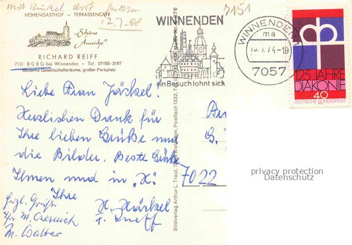74052873 alte Postkarte Buerg Winnenden Hoehengasthof Terrassencafe Schoene Aussicht postalisch gelaufen Erhaltung siehe scans [WerneD78] KatCode: 11110008119085