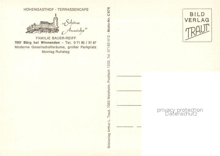 73255531 Buerg Winnenden Hoehengasthof Terrassencafe postalisch nicht gelaufen Erhaltung siehe scans [WerneD78] KatCode: 11110008119085
