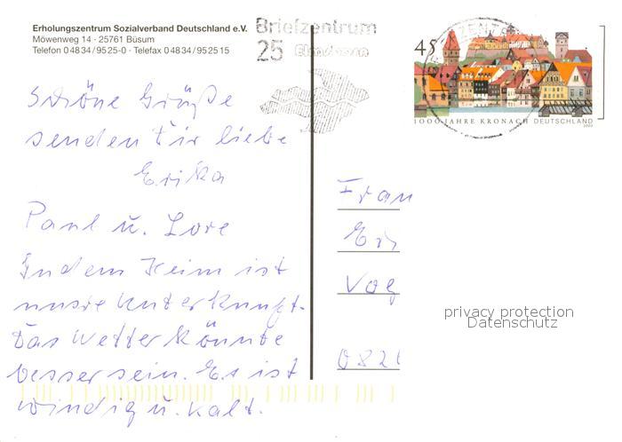 73323174 alte Postkarte Buesum Nordseebad Erholungszentrum Sozialverband Deutschland e.V. postalisch gelaufen Erhaltung siehe scans [LiesaD40] KatCode: 11110001051013