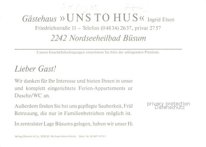 73094722 Buesum Nordseebad Gaestehaus Uns To Hus postalisch nicht gelaufen Keine Postkarte (siehe scan) Erhaltung siehe scans [NatalD47] KatCode: 11110001051013