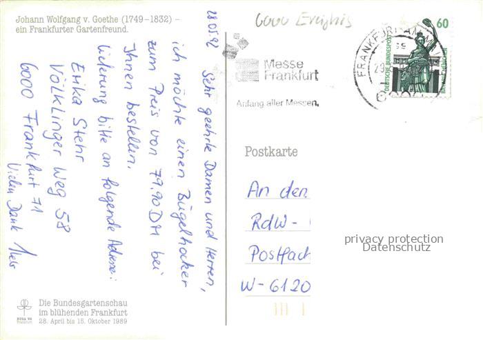 74041188 alte Postkarte BUGA Bundesgartenschau Frankfurt Johan Wolfgang Goethe Wurm postalisch gelaufen Erhaltung siehe scans [SanaeD93] KatCode: 22100000000100