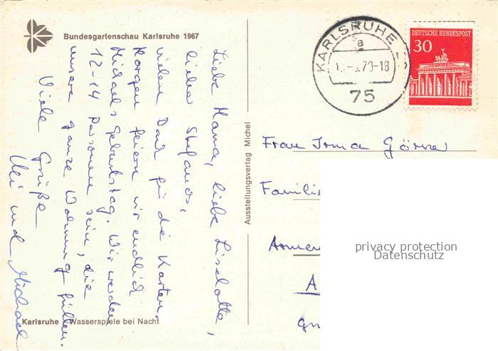 74053493 alte Postkarte BUGA Bundesgartenschau Karlsruhe Wasserspiel bei Nacht postalisch gelaufen Erhaltung siehe scans [IrynaD87] KatCode: 22100000000100