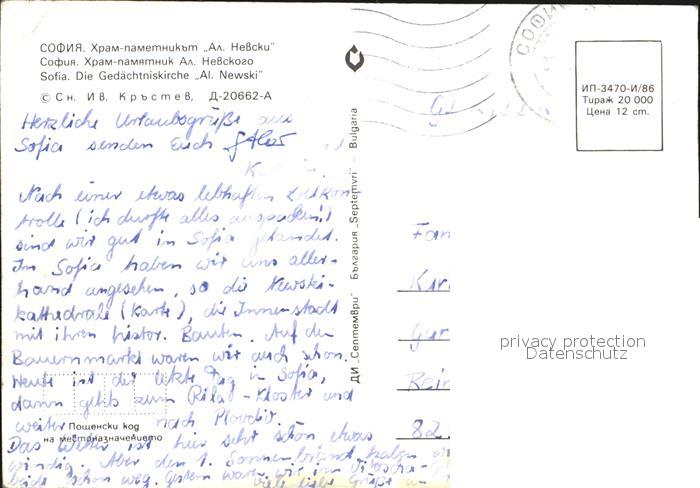 old postcard Bulgarien Sofia die Gedaechtniskirche Al Newski postalisch gelaufen Erhaltung siehe scans