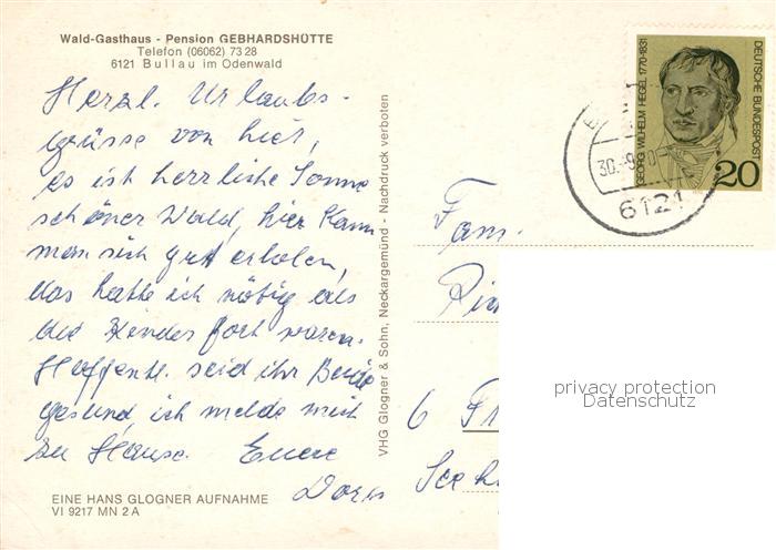73864615 alte Postkarte Bullau Erbach Wald Gasthaus Pension Gebhardshuette postalisch gelaufen Erhaltung siehe scans [WerneD78] KatCode: 11110006437006