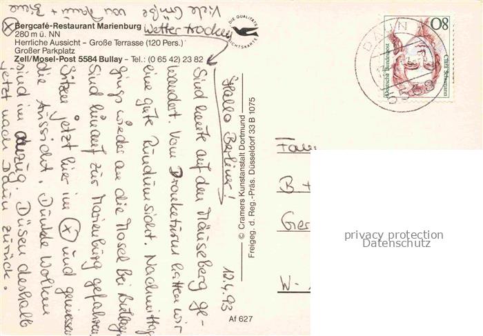 74039723 alte Postkarte Bullay Mosel Bergcafe Restaurant Marienburg Fliegeraufnahme postalisch gelaufen Erhaltung siehe scans [WerneD78] KatCode: 11110007135019