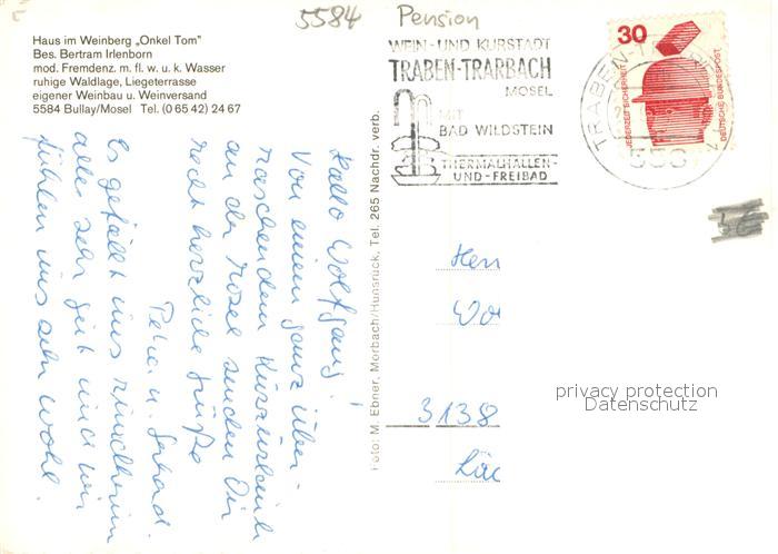 73705619 alte Postkarte Bullay Mosel Haus im Weinberg Onkel Tom postalisch gelaufen Erhaltung siehe scans [LiesaD40] KatCode: 11110007135019