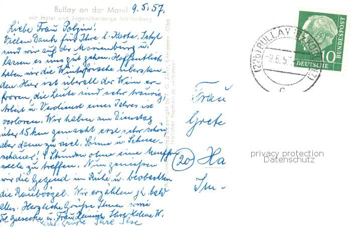 73820532 alte Postkarte Bullay Mosel mit Hotel und Jugendherberge Marienberg postalisch gelaufen Erhaltung siehe scans [WerneD78] KatCode: 11110007135019