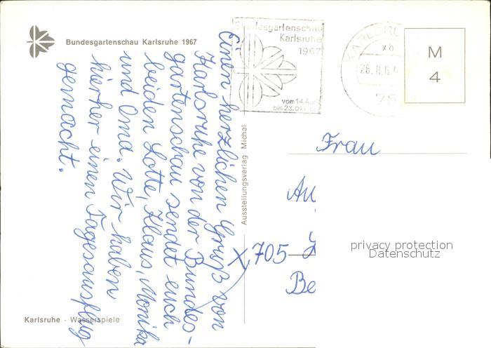 alte Postkarte Bundesgartenschau Karlsruhe Wasserspiele postalisch gelaufen Erhaltung siehe scans [PaolaD17 kt110box]