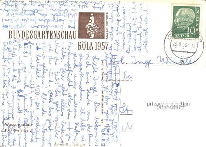alte Postkarte Bundesgartenschau Koeln 1957 Wassergarten postalisch gelaufen