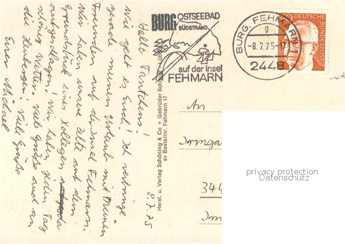 73781282 alte Postkarte Burg Fehmarn Fehmarnsundbruecke Faehre Hafen Strand Hochhaeuser Segeln postalisch gelaufen Erhaltung siehe scans [FriedD77] KatCode: 11110001055046