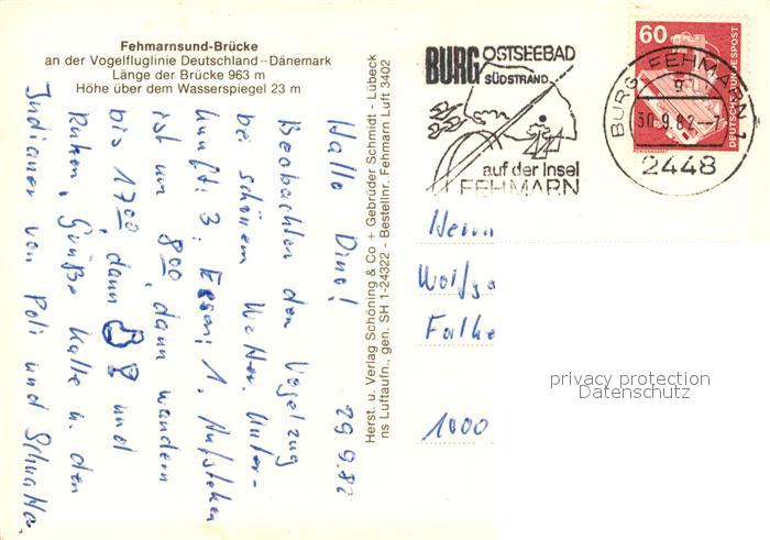 73084402 alte Postkarte Burg Fehmarn Fehmarnsundbruecke Vogelfluglinie Deutschland Daenemark Fliegeraufnahme postalisch gelaufen Erhaltung siehe scans [FriedD77] KatCode: 11110001055046