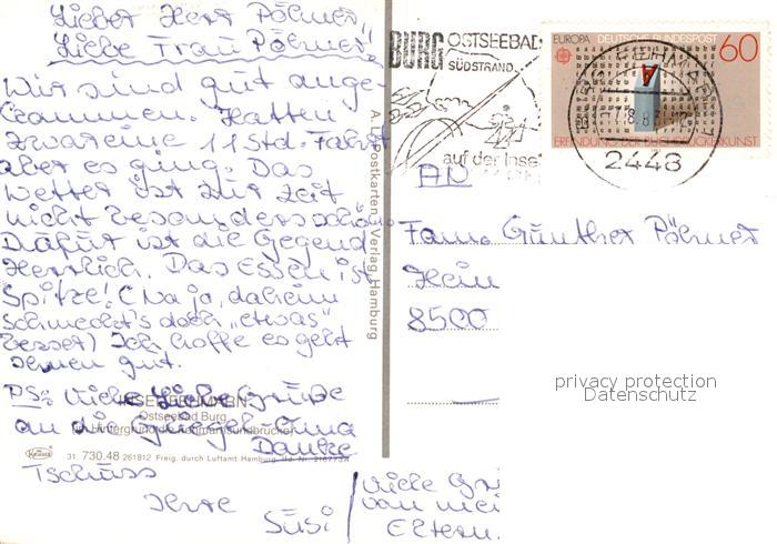 73040948 alte Postkarte Burg Fehmarn Ostseebad im Hintergrund Fehmarnsundbruecke Fliegeraufnahme postalisch gelaufen Erhaltung siehe scans [FriedD77] KatCode: 11110001055046