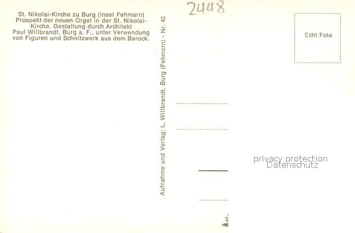 73694772 Burg Fehmarn St. Nikolai Kirche Neue Orgel postalisch nicht gelaufen Erhaltung siehe scans [FriedD77] KatCode: 11110001055046