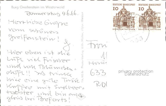 72392830 alte Postkarte Burg Greifenstein Westerwald postalisch gelaufen Erhaltung siehe scans KatCode: 11110006532010