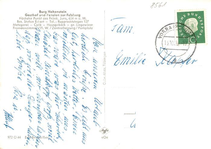 73886380 Burg Hohenstein Kirchensittenbach Mittelfranken Gasthof Pension zur Felsburg postalisch gelaufen Erhaltung siehe scans [FriedD77] alte Postkarte Frie Katcode 11110009574135