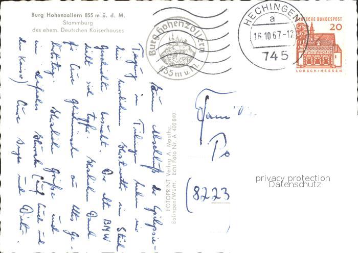 72210275 alte Postkarte Burg Hohenzollern postalisch gelaufen Erhaltung siehe scans KatCode: 11110008417008