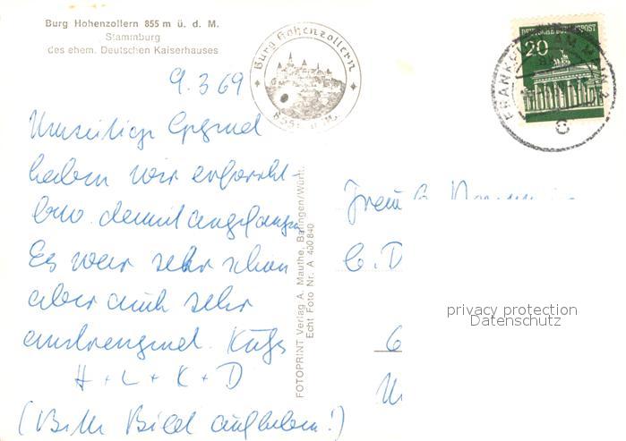 73300204 alte Postkarte Burg Hohenzollern Fliegeraufnahme postalisch gelaufen Erhaltung siehe scans [PaolaD17] KatCode: 11110008417008