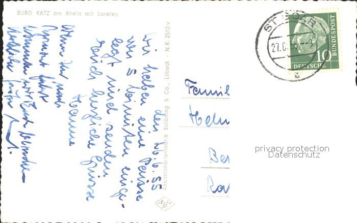 71930235 alte Postkarte Burg Katz Loreley postalisch gelaufen Erhaltung siehe scans KatCode: 11110007141121