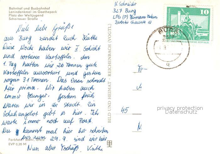 73652176 alte Postkarte Burg Magdeburg Bahnhof Busbahnhof Lenindenkmal im Goethepark Platz der Weltjugend Schartauer Strasse postalisch gelaufen Erhaltung siehe scans [WerneD78] KatCode: 11110015086015
