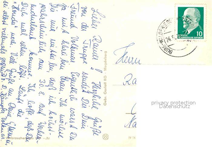 72633018 alte Postkarte Burg Magdeburg Magdeburger Strasse Rathaus Flickschupark Goethepark postalisch gelaufen Erhaltung siehe scans [FriedD77] KatCode: 11110015086015