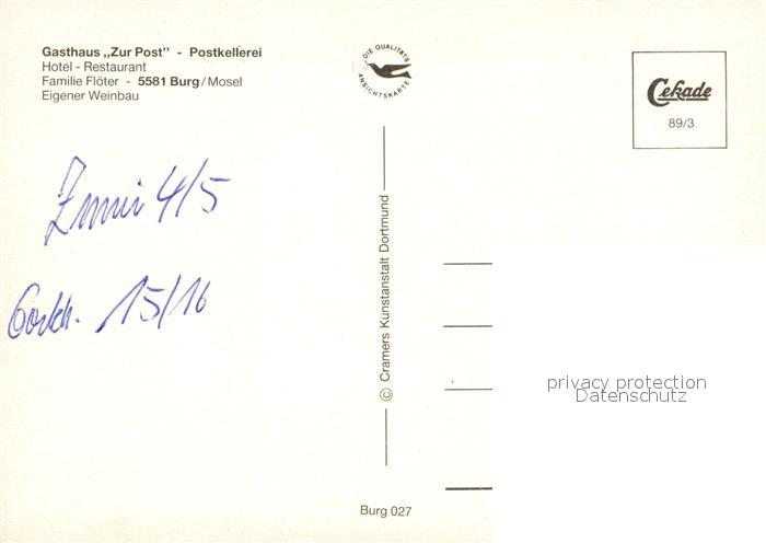 73643408 alte Postkarte Burg Mosel Gasthaus Zur Post Postkellerei Gaststube Terrasse postalisch gelaufen Erhaltung siehe scans [WerneD78] KatCode: 11110007231014