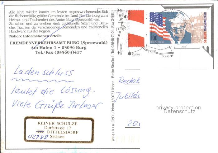 72063196 alte Postkarte Burg Spreewald Hafen Waldschloesschen Hahnrupfen Tracht postalisch gelaufen Erhaltung siehe scans KatCode: 11110012071032