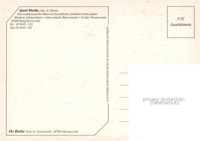 73659772 Burg Spreewald Hotel Bleske Restaurant Trachten postalisch nicht gelaufen Erhaltung siehe scans [FriedD77] KatCode: 11110012071032