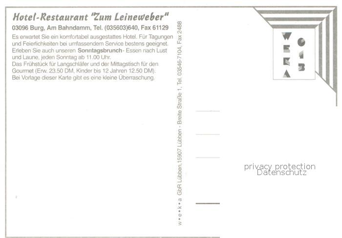 73732414 Burg Spreewald Hotel Restaurant Zum Leineweber Brunch postalisch nicht gelaufen Erhaltung siehe scans [FriedD77] KatCode: 11110012071032