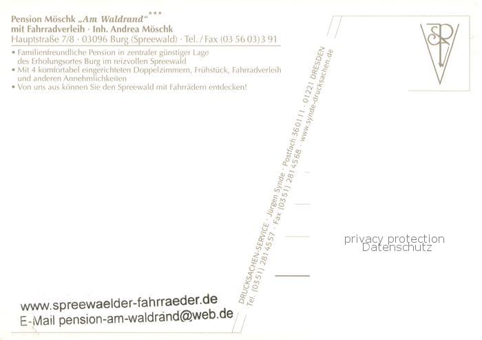 73751937 Burg Spreewald Pension Moeschk Am Waldrand Zimmer Boots und Fahrrad Touren postalisch nicht gelaufen Erhaltung siehe scans [WerneD78] KatCode: 11110012071032