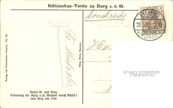 71839877 alte Postkarte Burg Wupper Adolf III. von Berg Erbauung Burg Adolf I. Schlossbau-Verein postalisch gelaufen Erhaltung siehe scans KatCode: 11110005122000