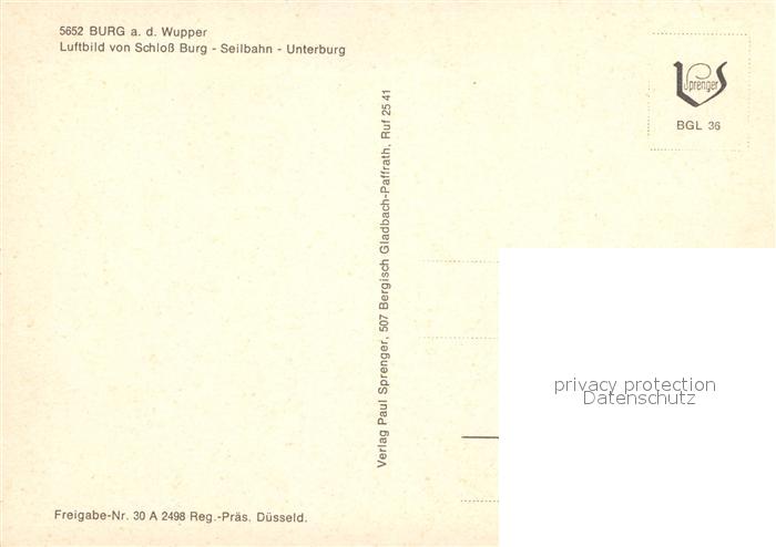 72951697 Burg Wupper Fliegeraufnahme Schloss Burg Seilbahn Unterburg postalisch nicht gelaufen Erhaltung siehe scans [NatalD47] KatCode: 11110005122000
