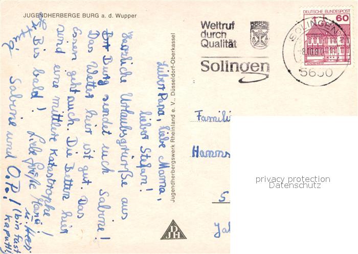 72931278 alte Postkarte Burg Wupper Jugendherberge postalisch gelaufen Erhaltung siehe scans [KathaD81] KatCode: 11110005122000