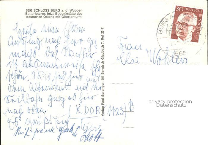 72227398 alte Postkarte Burg Wupper Schloss Burg Batterieturm mit Glockenturm postalisch gelaufen Erhaltung siehe scans KatCode: 11110005122000