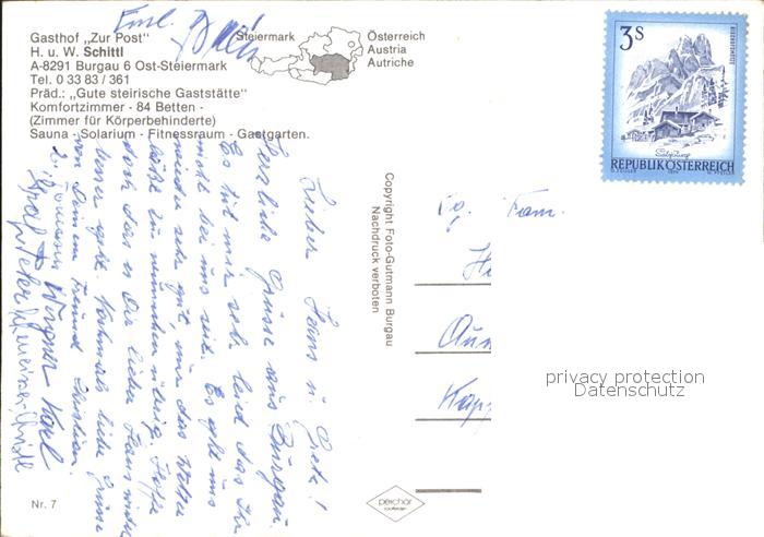 72051505 alte Postkarte Burgau Steiermark Gasthof Zur Post Schwimmbad Gasthof Meier Meier Schittl postalisch gelaufen Erhaltung siehe scans KatCode: 11390224060503