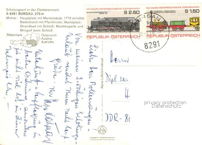73571589 alte Postkarte Burgau Steiermark Hauptplatz Mariensaeule Badestrand Pfarrkirche Strandbad mit Schloss Musikkapelle Minigolf Schloss postalisch gelaufen Erhaltung siehe scans [WerneD78] KatCode: 11390224060503